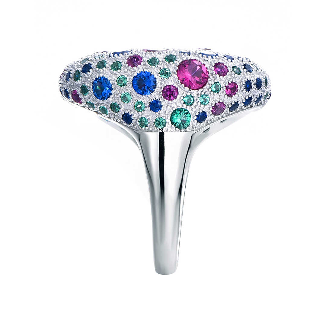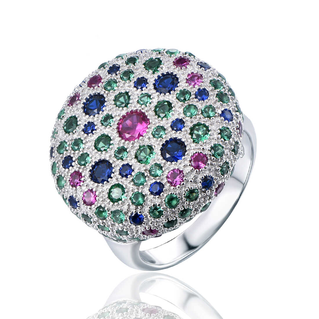 טבעת כסף משובצת אבני זרקון צבעונית בציפוי רודיום.