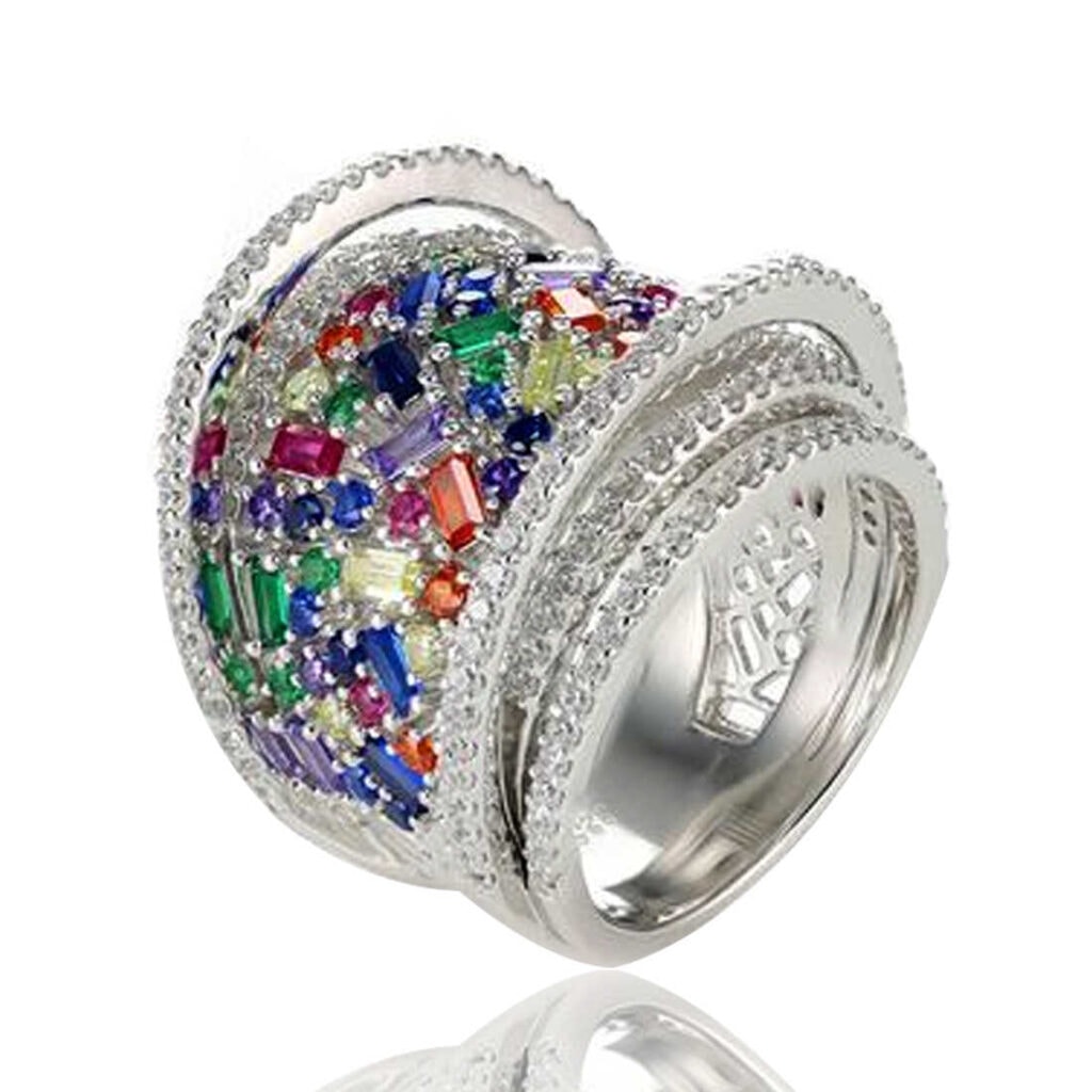 טבעת מכסף טהור 925 (סטרלינג סילבר) צבעונית עם ציפוי רודיום מבריק ואיכותי, בתוספת שיבוץ אבני זירקונים דרגת A5 בצורת בגט.