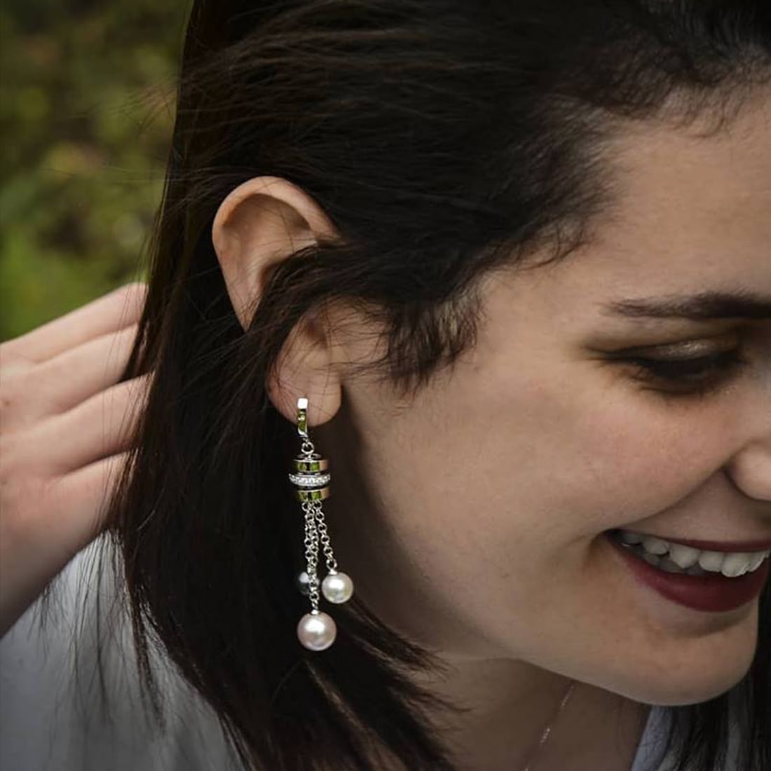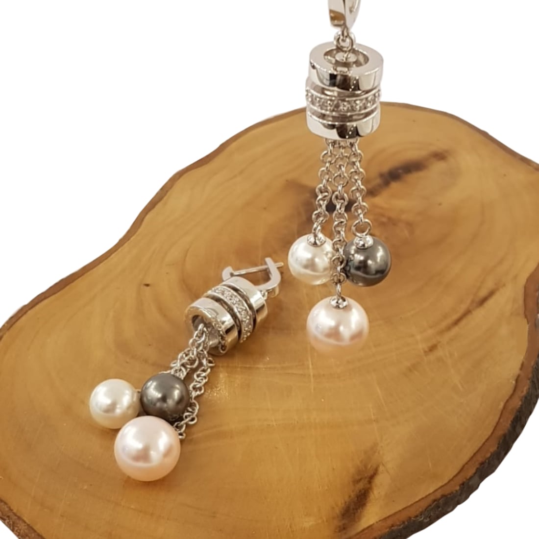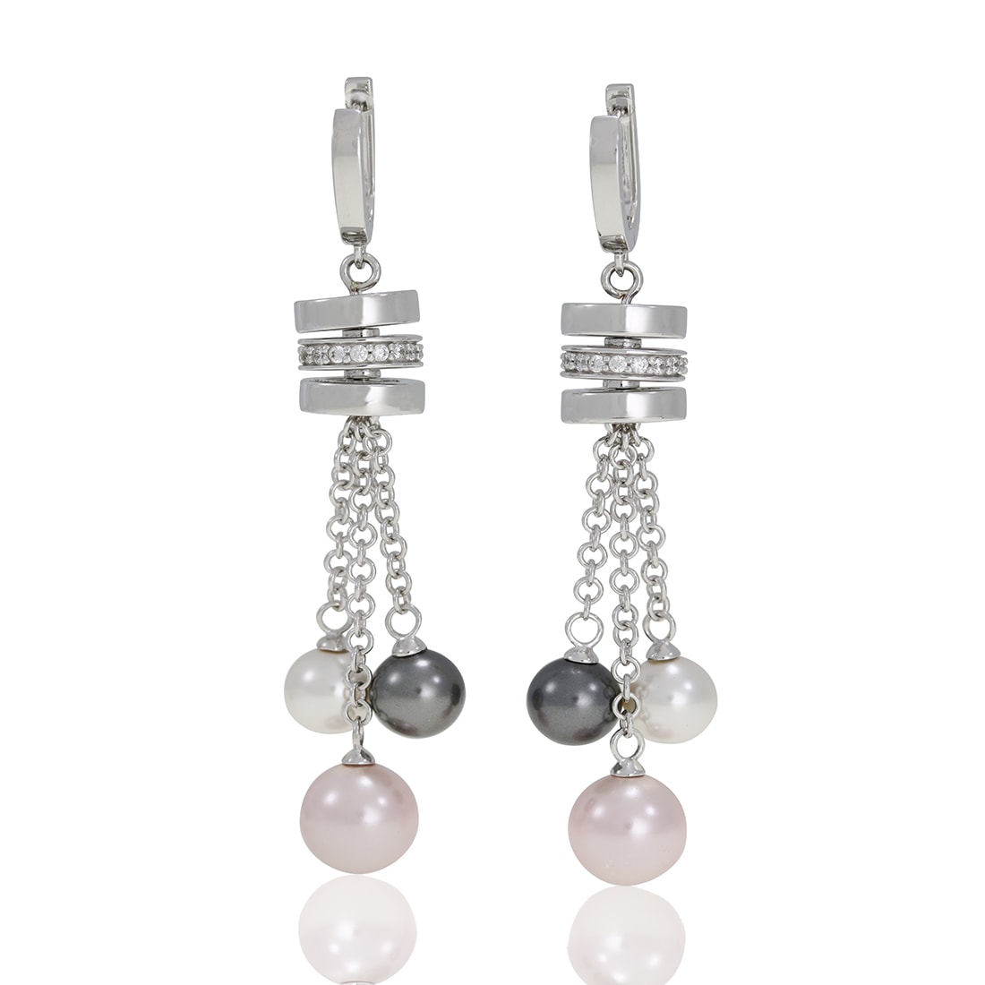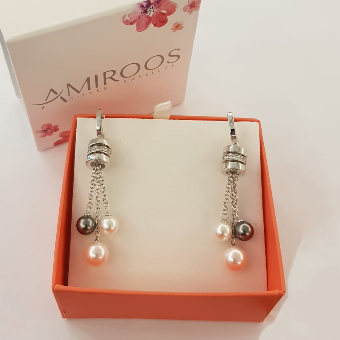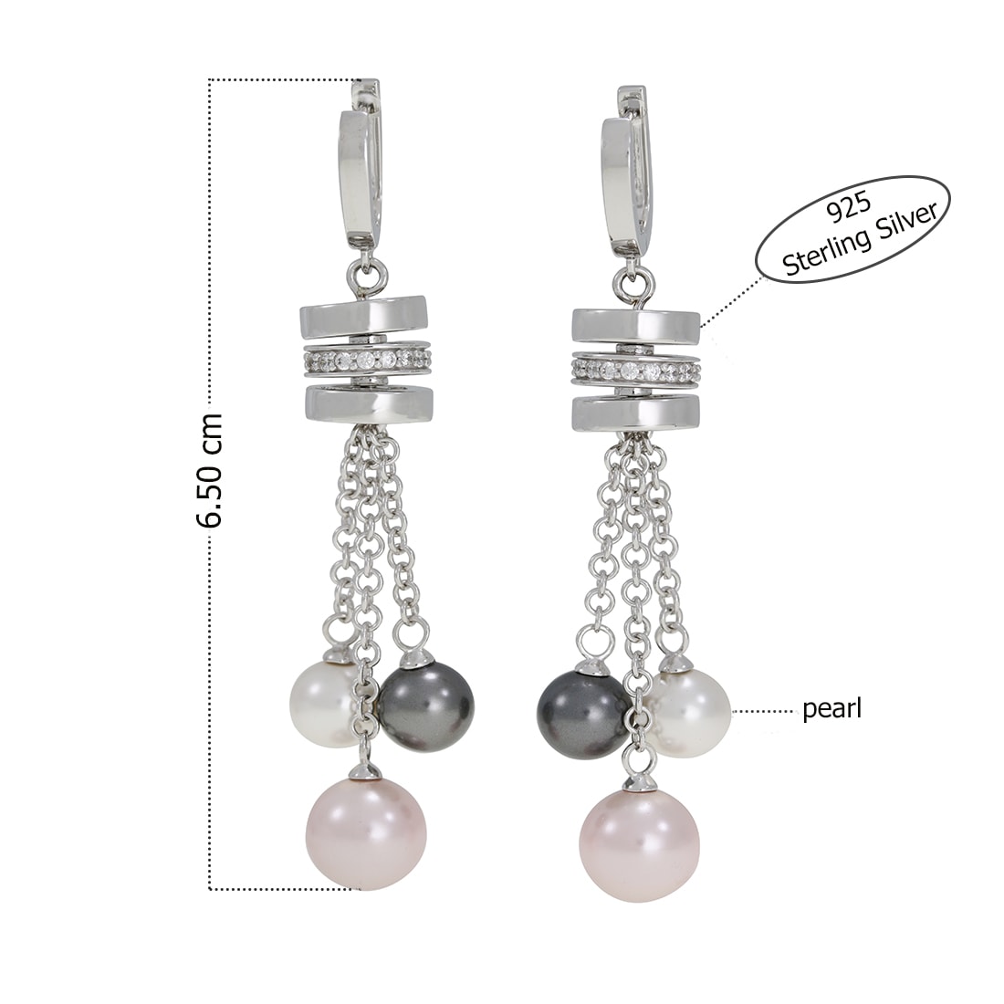 עגילים תלויים מכסף 925 עם שילוב פנינים אמיתיים שלושה צבעים, בתוספת שיבוץ אבני זירקוניה איכותיים AAA, המעניקה לך מראה מיוחד