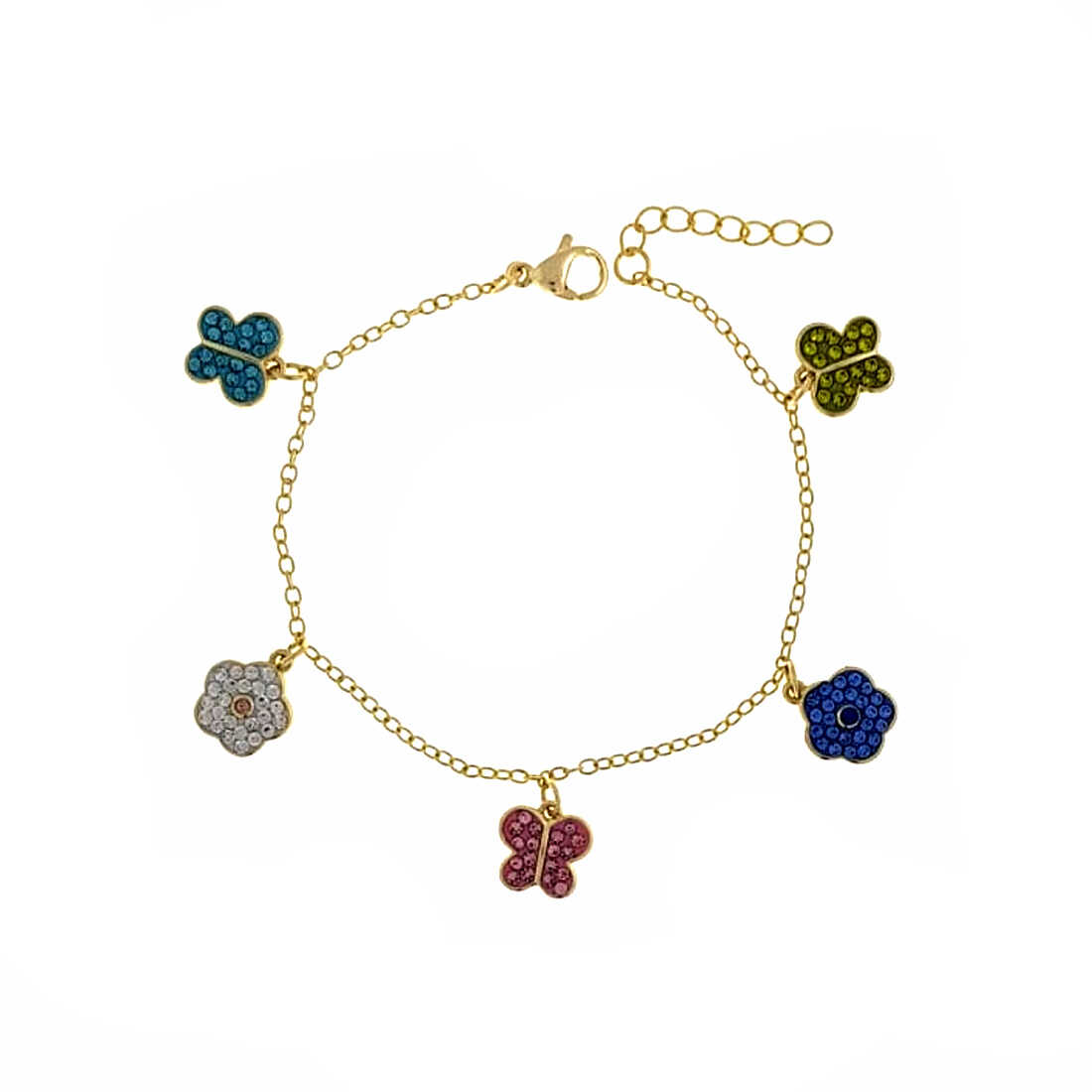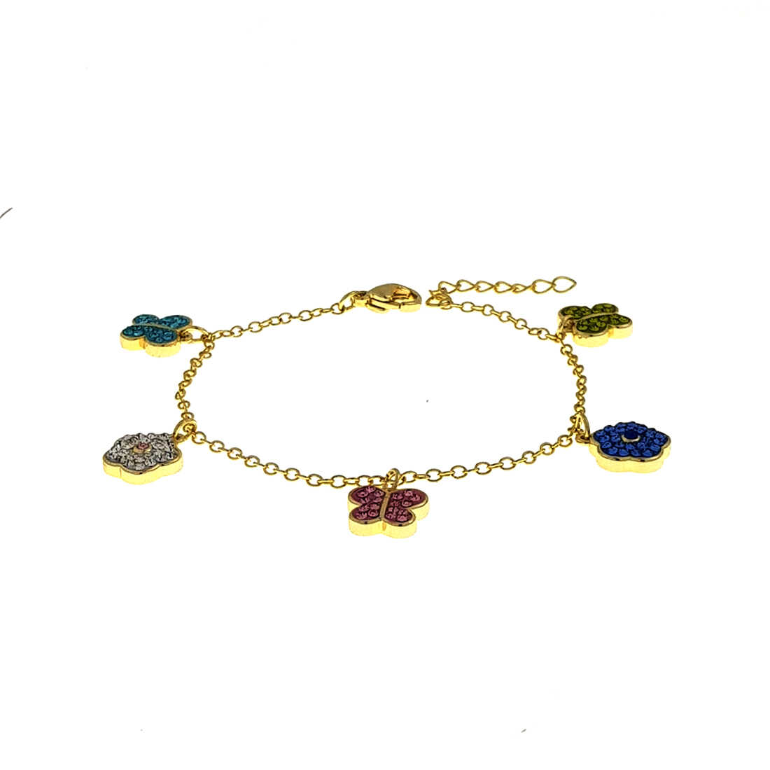 צמיד משובץ לילדות עשוי ממתכץ בראס חזקה (Brass) עם תליונים משובצים זירקונים צבעוניים בצורת פרחים ופרפרים, אורך הצמיד