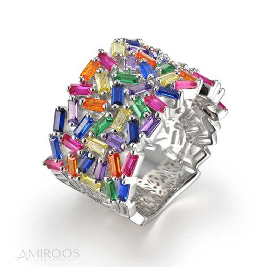 טבעות אבני חן צבעוניות מכסף טהור 925 (סטרלינג סילבר) צבעונית עם ציפוי רודיום מבריק ואיכותי, בתוספת שיבוץ אבני זירקונים דרגת A5 בצורת בגט.