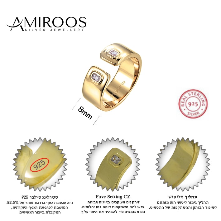 הטבעת עשויה מכסף טהור (925) מצופת זהב צהוב. עם שיבוץ 2 אבני זירקוניה.