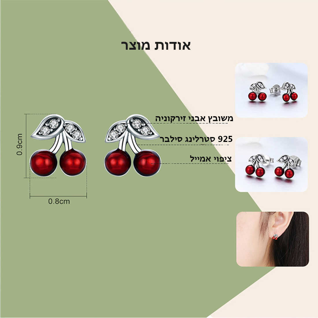 עגילים מעוצבים בצורת דובדבנים לילדות. עשויים מכסף אמיתי 925 סטרלינג סילבר. מצופים עם ציפוי רודיום ששומרת על העגילים שלא ישחירו ועל הברק והצבע.