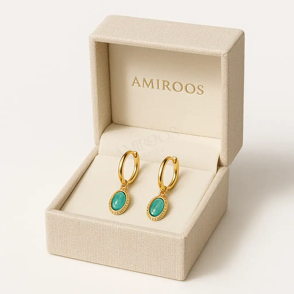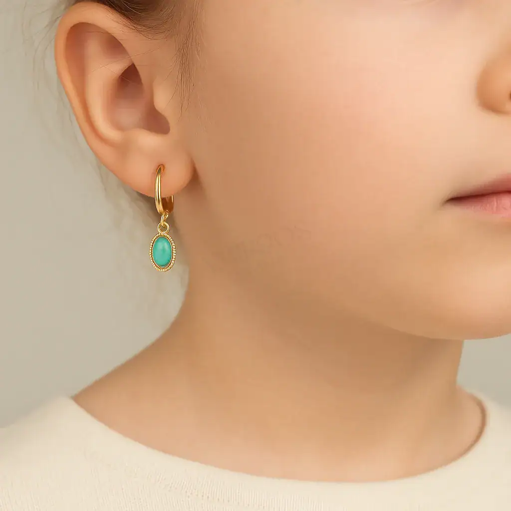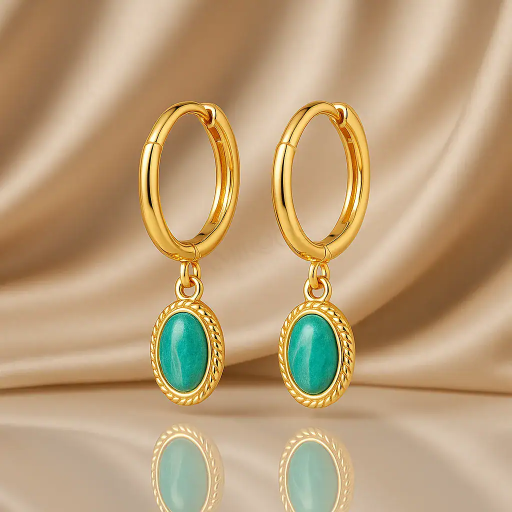 העגילים התלויים הללו מעוצבים בהשראת יופיו הטבעי של הים התיכון. כל עגיל מורכב מחישוק זהב עגול ומוזהב, מעוטר בפרטים עדינים שמוסיפים טקסטורה ועומק. מהחישוק תלוי אלמנט בצורת אבן ירוק טורקיז, המוקף בדמות חבל זהב, שמוסיף נופך של עדינות וסגנון.