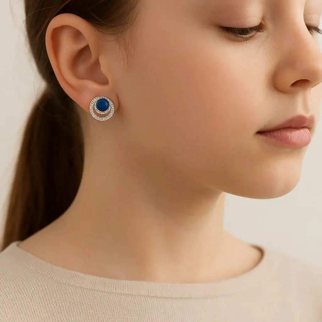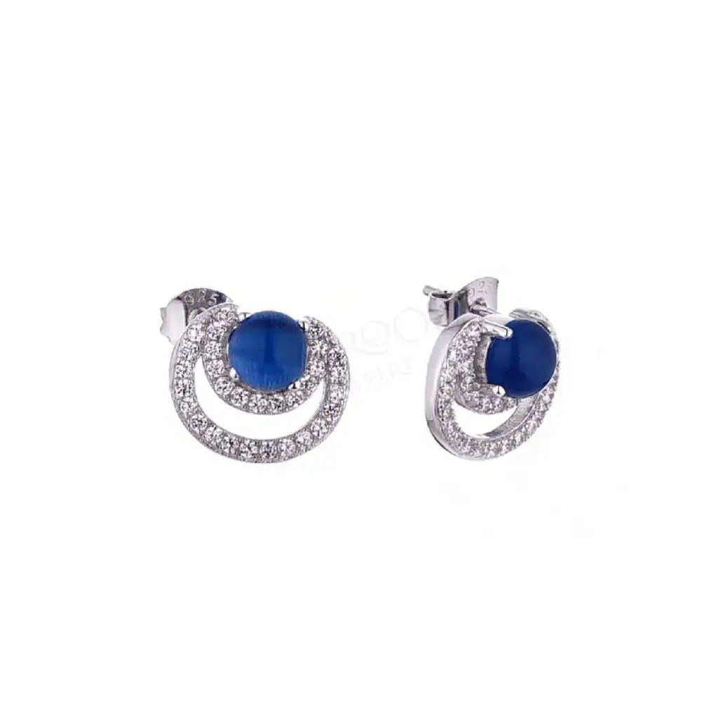 עגילים אלו עשויים מכסף 925 ומצופים ברודיום למראה נטול זמן. האבן הכחולה במרכז, מוקפת בשתי טבעות משובצות זירקונים, מעניקה עומק ובהירות שאין כמותם. כל עגיל הוא פועל יצירה, תוצר של מחשבה עמוקה והקפדה על פרטים.