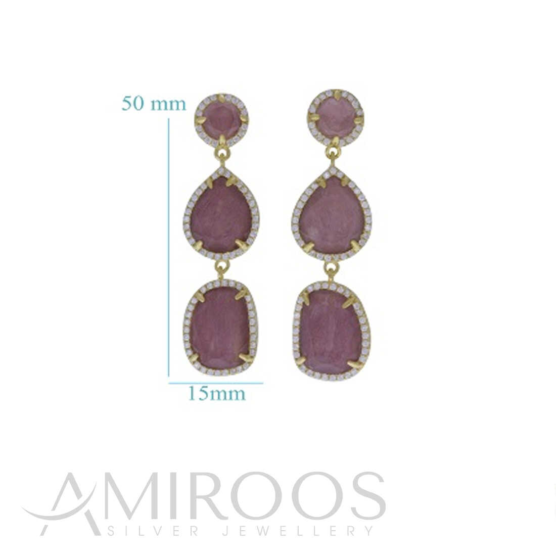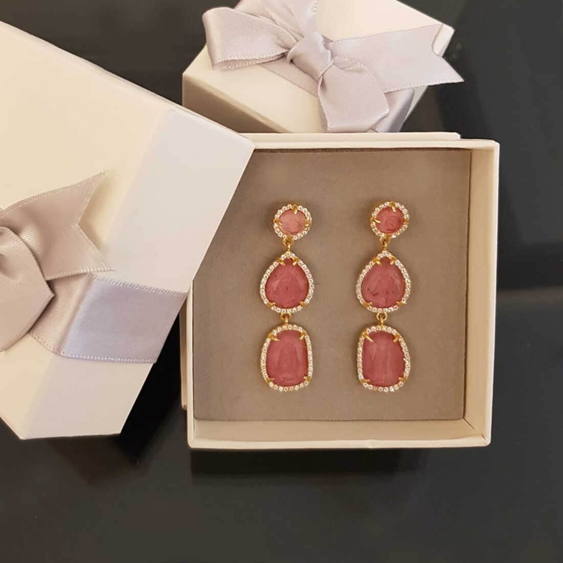 עגילי כסף עם אבני חן זכוכית בצבע ורוד ומסביב שיבוץ זרקונים שקופים.