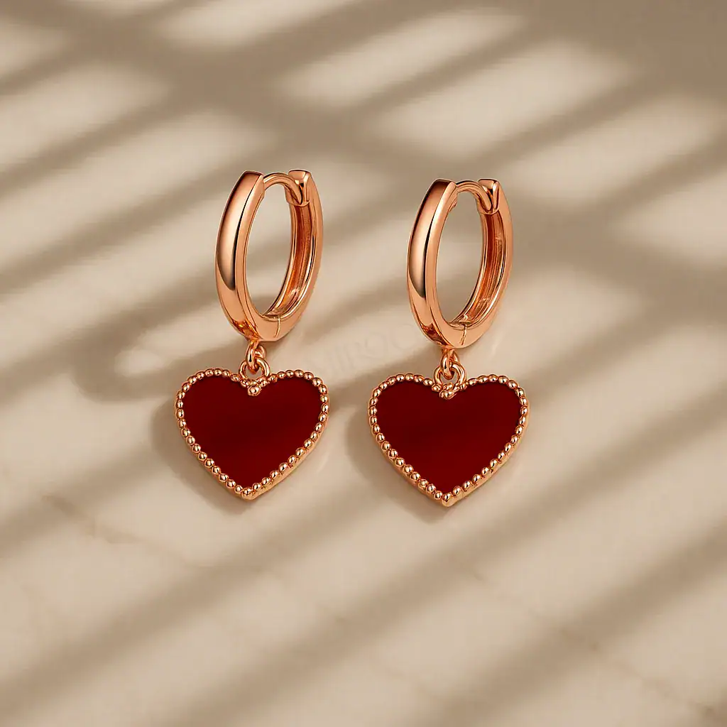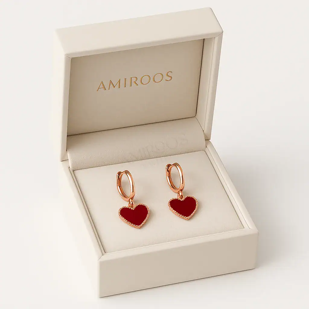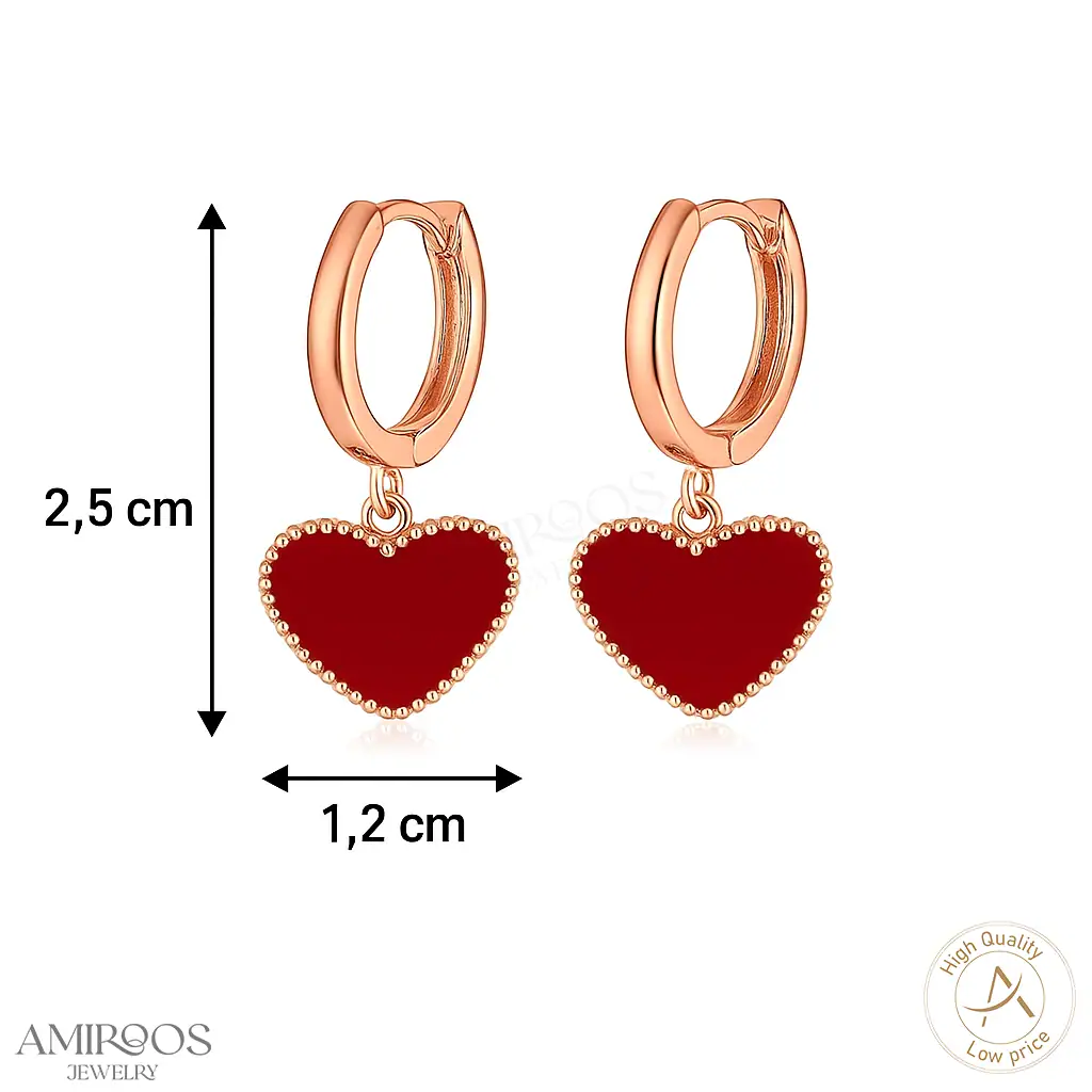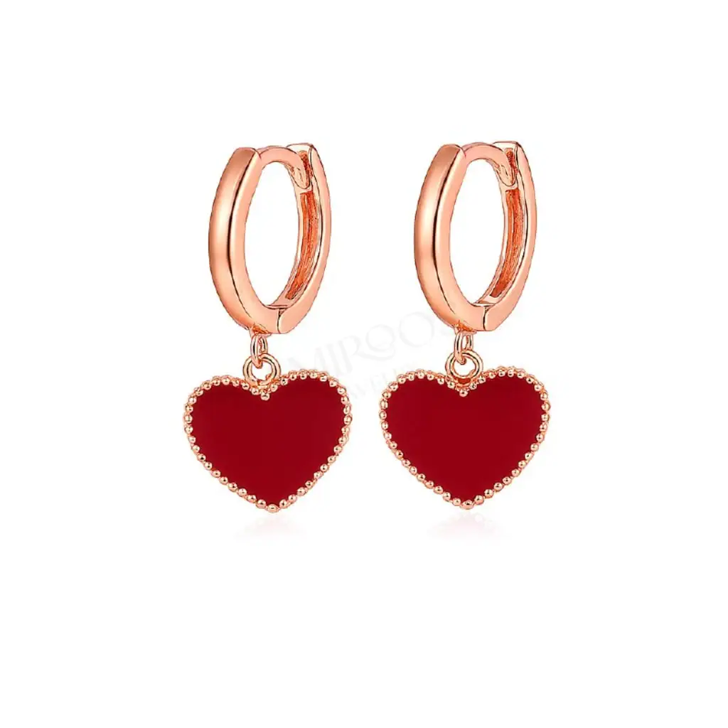 עגילי לב ורודים אלו מבוססים על עיצוב מודרני ומרהיב שבמרכזו לב אנאמל אדום מוקף זירקונים דקיקים. המתכת מצופה בצבע רוז גולד, מה שנותן להם מראה חם ומזמין.