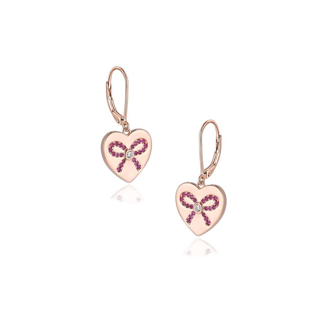 עגילי לב מכסף אמיתי 925 עם אבני זרקוניה אדומים משובצים בצורת פפיון. מצופים זהב ורוד.