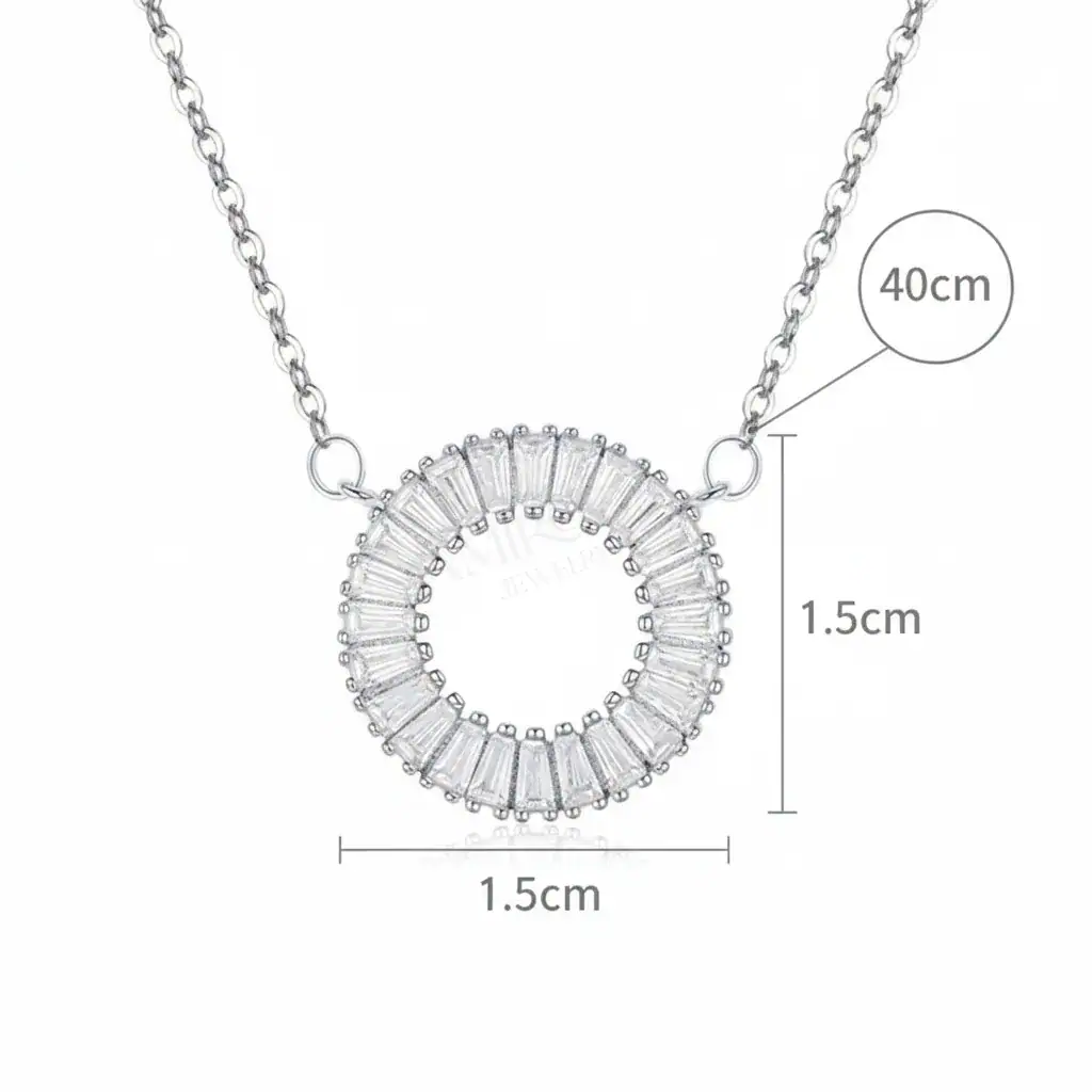 עיגול כסף משובץ בעיצוב מרהיב, נוצץ ומלא סטייל, שישדרג כל הופעה שלך. השרשרת העדינה הזו, מצופה רודיום מבריק ומשובצת אבני זירקון מנצנצות, תופסת את העין ותוסיף לך זוהר ייחודי.