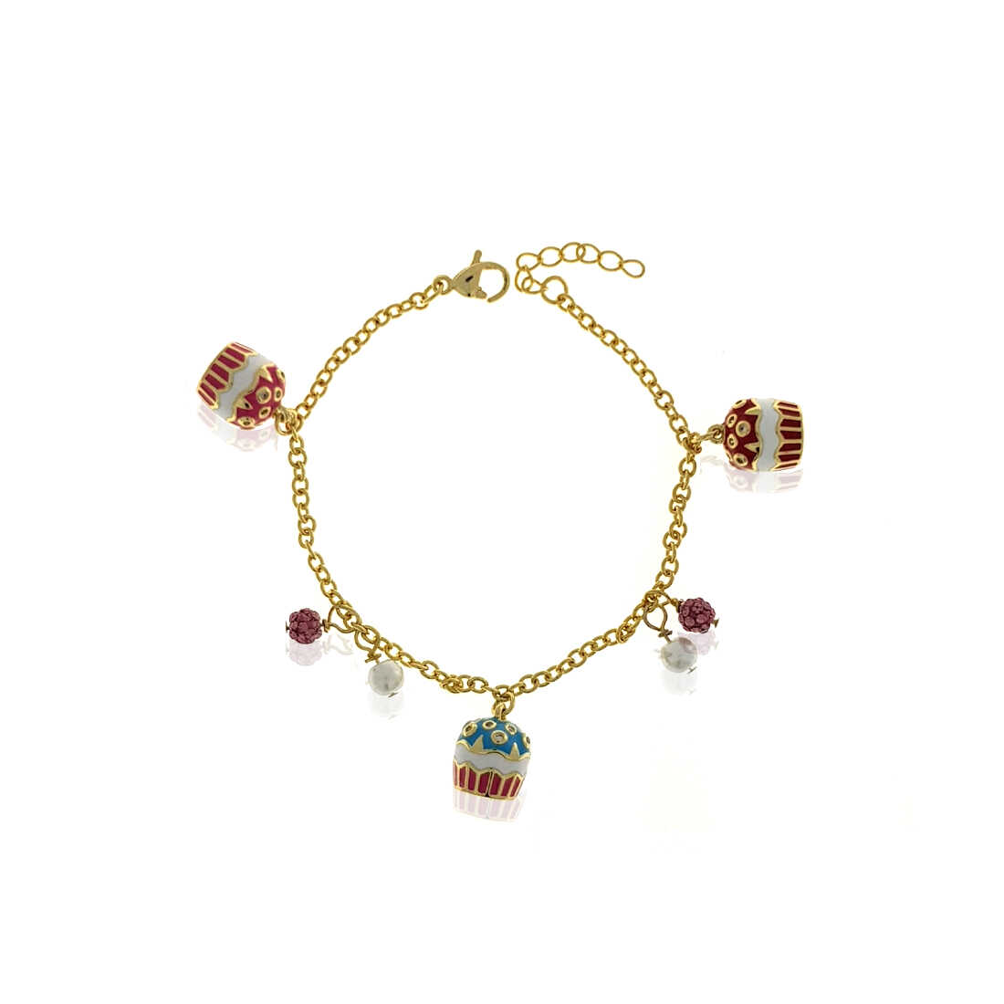 צמיד תליונים עוגה עשוי ממתכת בראס (Brass) חזקה, עם ציפוי זהב צהוב איכותי, בתוספת ציפוי אמייל צבעונית. אורך הצמיד____