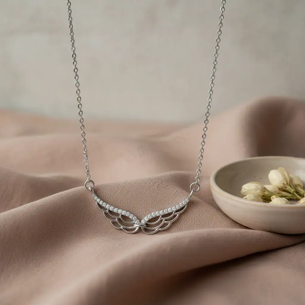 שרשרת כנפיים כסף היא תכשיט עוצר נשימה, המשלב אלגנטיות עם סמליות עמוקה. השרשרת מעוצבת בצורת כנפיים עדינות, משובצות זירקונים נוצצים, היוצרים מראה זוהר ומרשים. הכנפיים, המצופות רודיום איכותי, מעניקות תחושה של קלילות וחופש, ומשדרות סטייל ייחודי ובלתי נשכח.