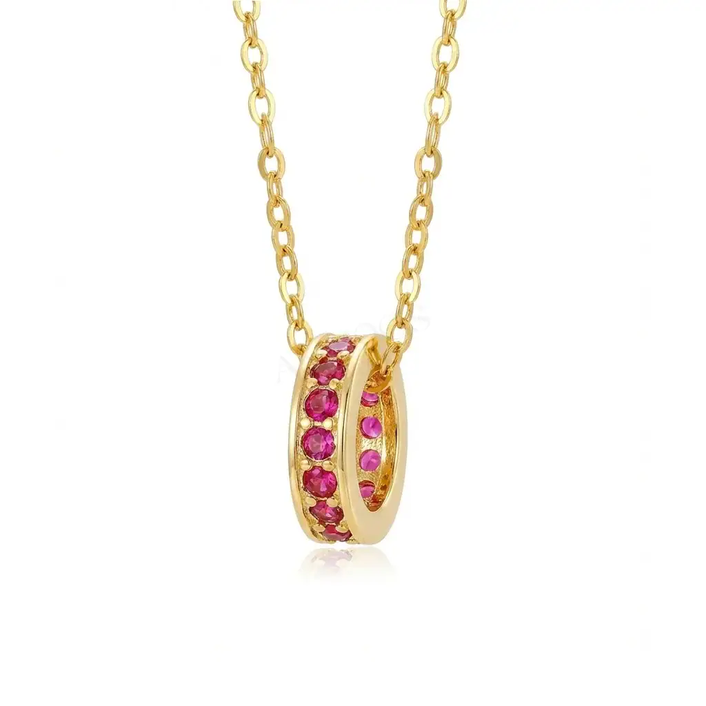 שרשרת עדינה לאישה זו היא התגלמות היופי הקלאסי, מעוצבת בציפוי זהב צהוב מרהיב ומשובצת בשורות של זירקונים נוצצים בגוון רובי עשיר. העיצוב המעגלי והעדין יוצר תכשיט אלגנטי להפליא, המושלם לכל אירוע.