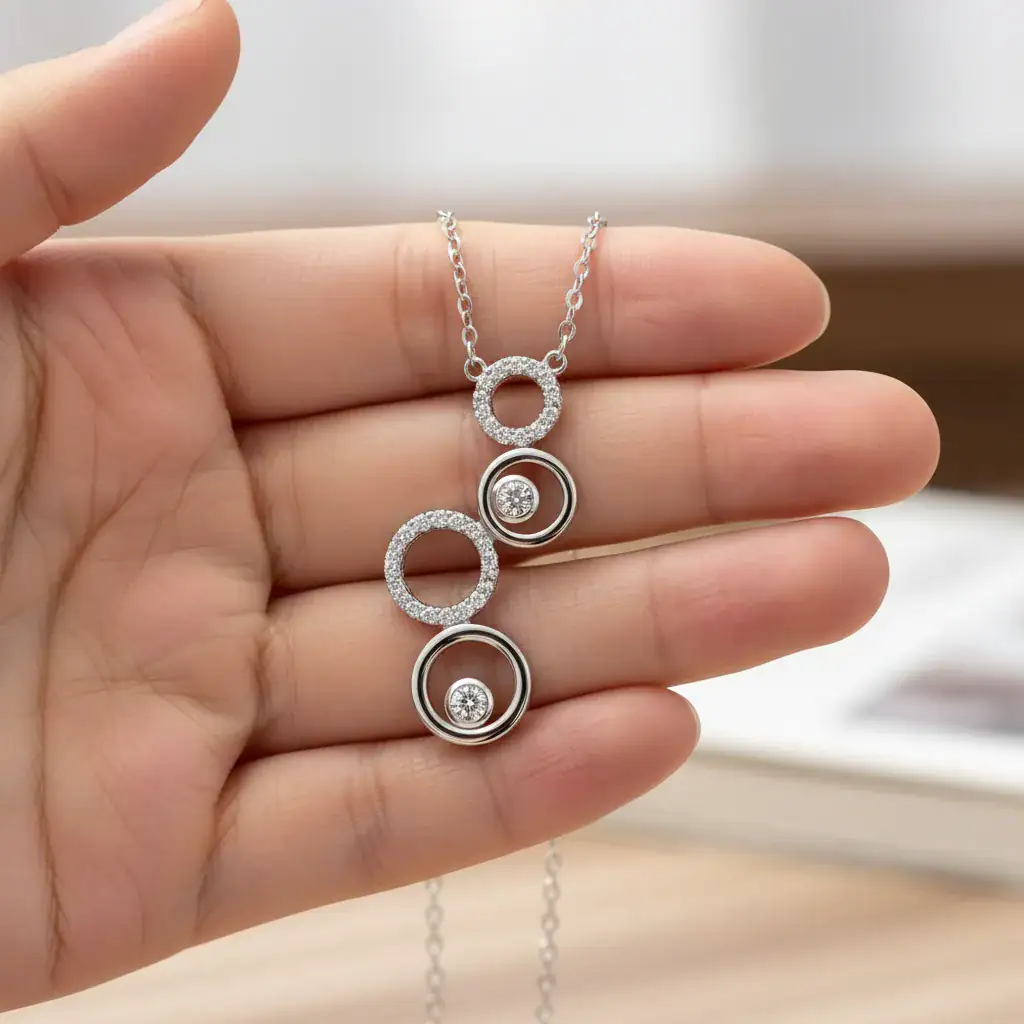 שרשרת עיגולים כסף זוהרת ומרהיבה, היא תוספת אלגנטית לכל מלתחה. העיצוב העדין של שלושה עיגולים משולבים, משובצים זירקונים נוצצים, יוצר מראה יוקרתי ומרשים. השרשרת עשויה מכסף 925 בציפוי רודיום המעניק לה ברק עמיד ומראה מודרני.