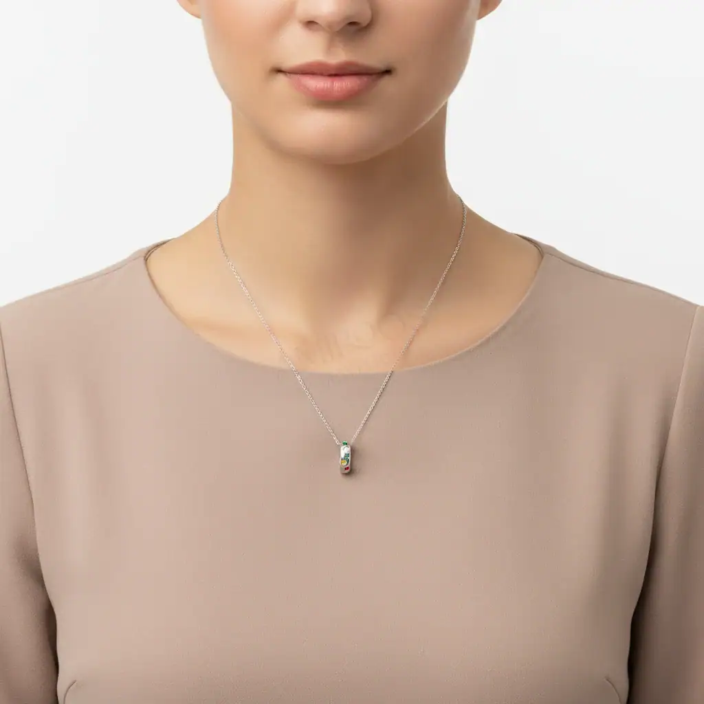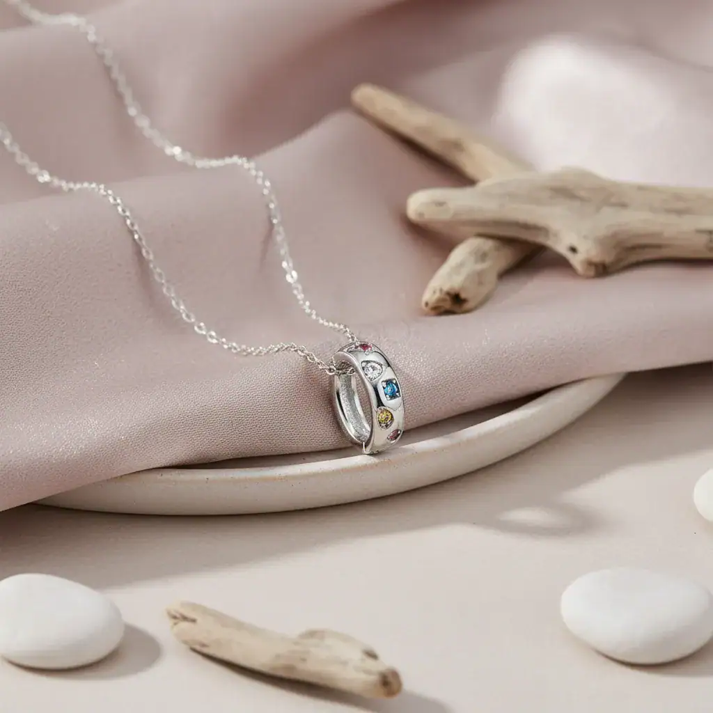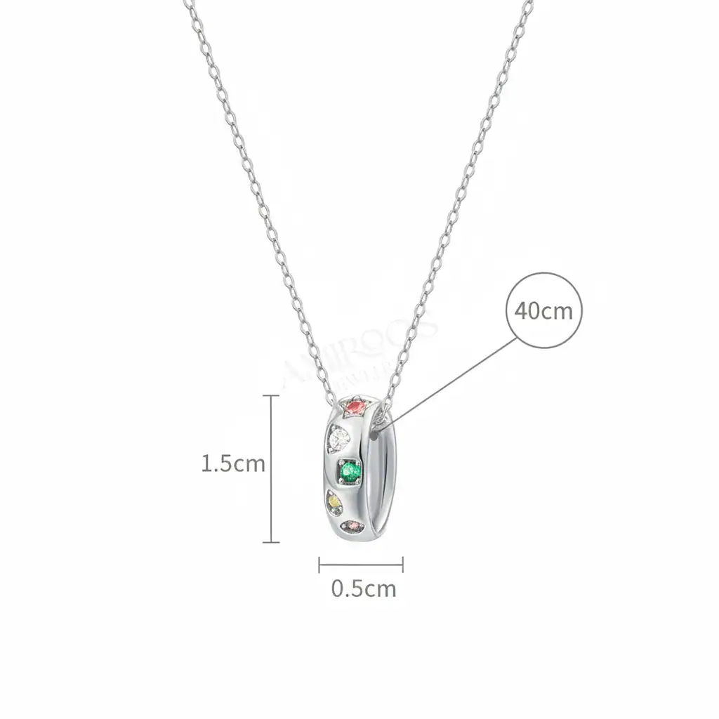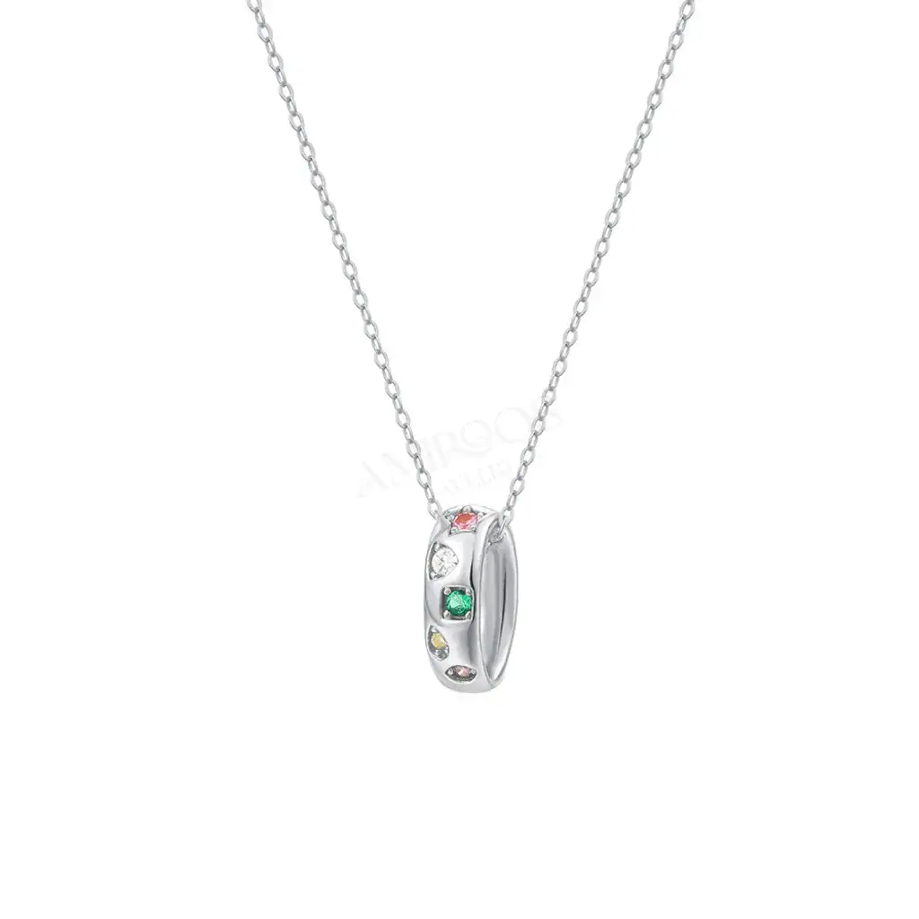 תליון חישוק כסף זה הוא תכשיט עדין אך נוכח, המשלב אלגנטיות מודרנית עם טאץ' צבעוני שובב. החישוק הכסוף, מצופה רודיום מבריק, משובץ באבני זירקון צבעוניות עדינות, המעניקות לו מראה ייחודי ומושך את העין.