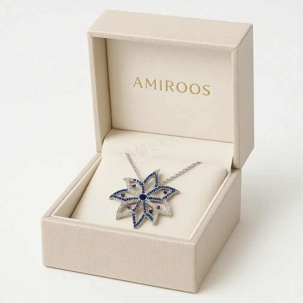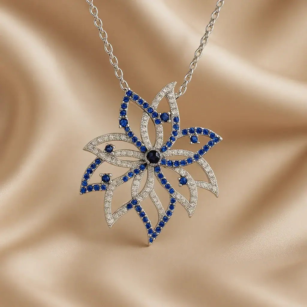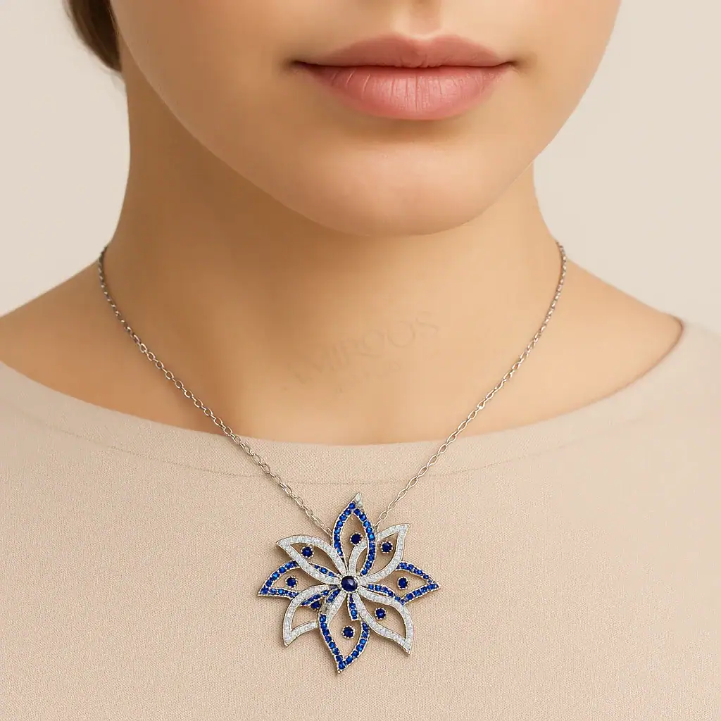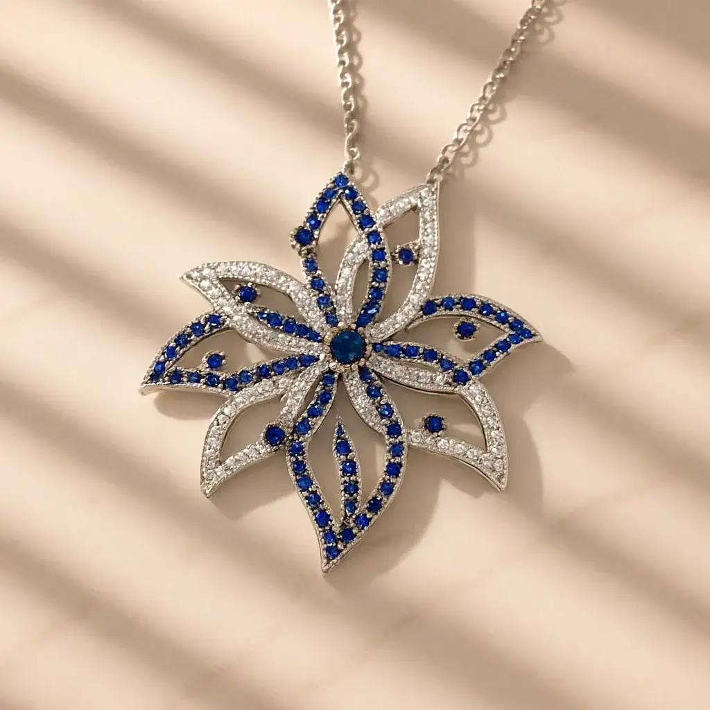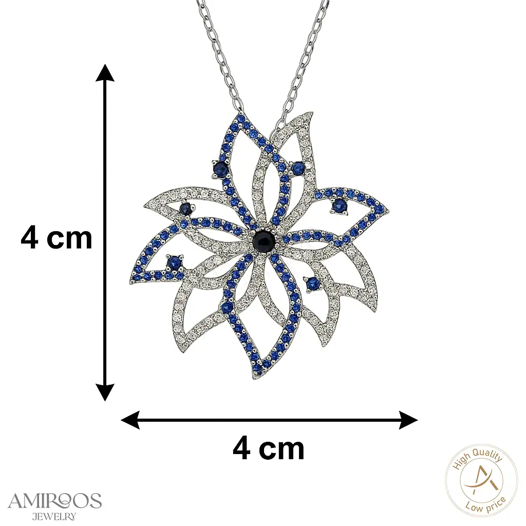 תכשיט זה נוצר מתוך השראה של פרחים טבעיים, תוך שימוש באבני זירקון כחולות ולבנות המוסיפות נוצץ וזוהר. כל פרט עוצב בקפידה, מהשוליים הדקיקים ועד לבסיס התליון, העשוי מבראס עם ציפוי רודיום, המעניק לו מראה אלגנטי ועמידות לשנים רבות.