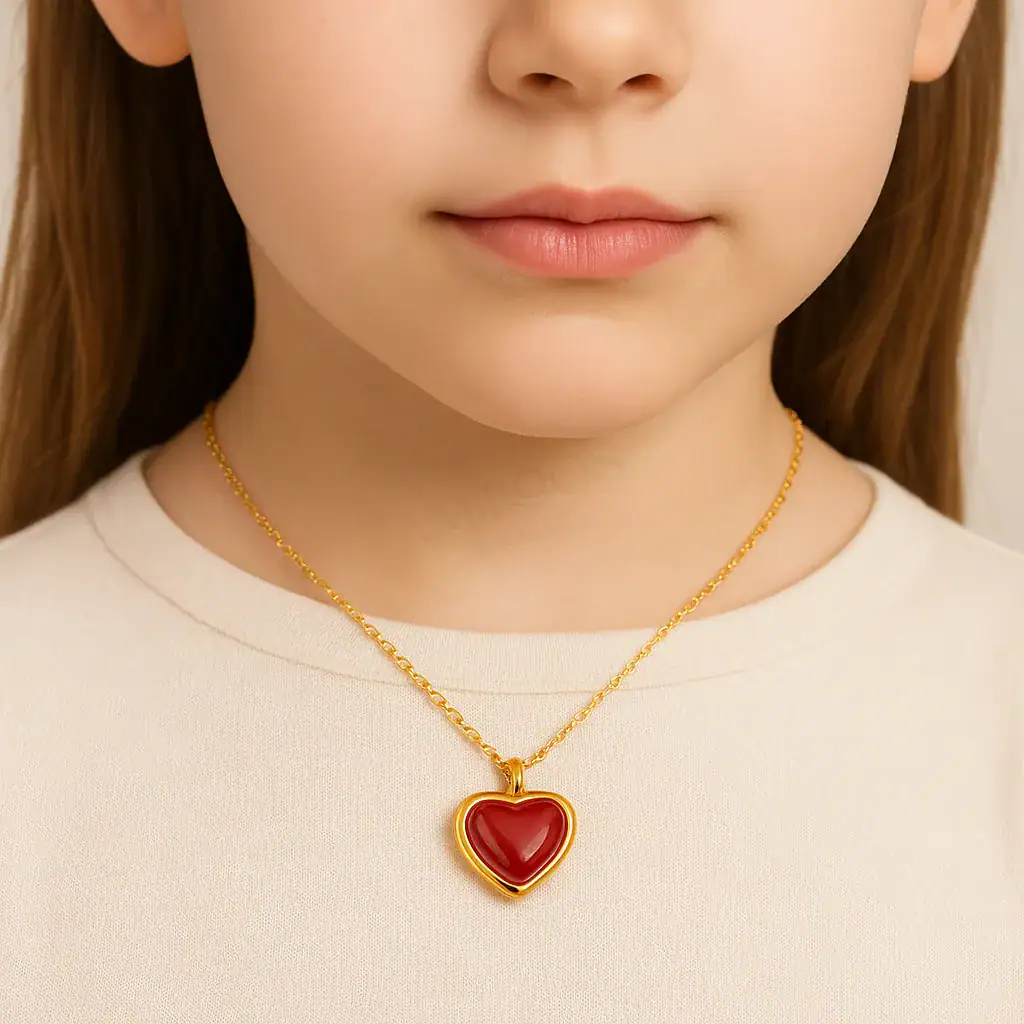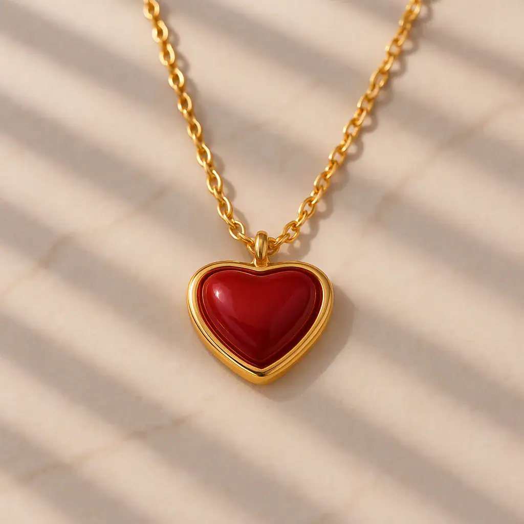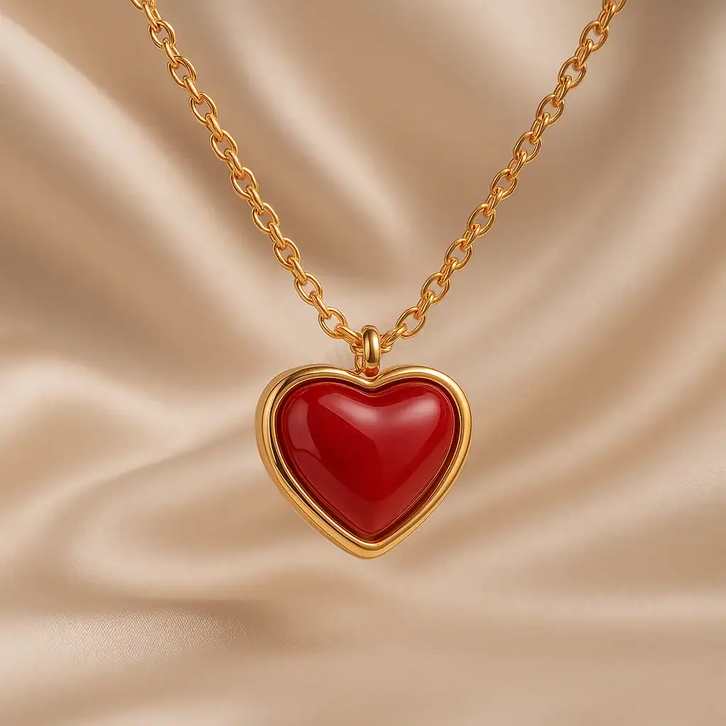 התליון מעוצב בצורת לב אלגנטית, מוקף במסגרת זהובה עדינה המבליטה את החומר האדום המרכזי. זהו עיצוב שמשלב בין קלאסיות למודרניות, ויוצר תחושה של חום ואהבה.