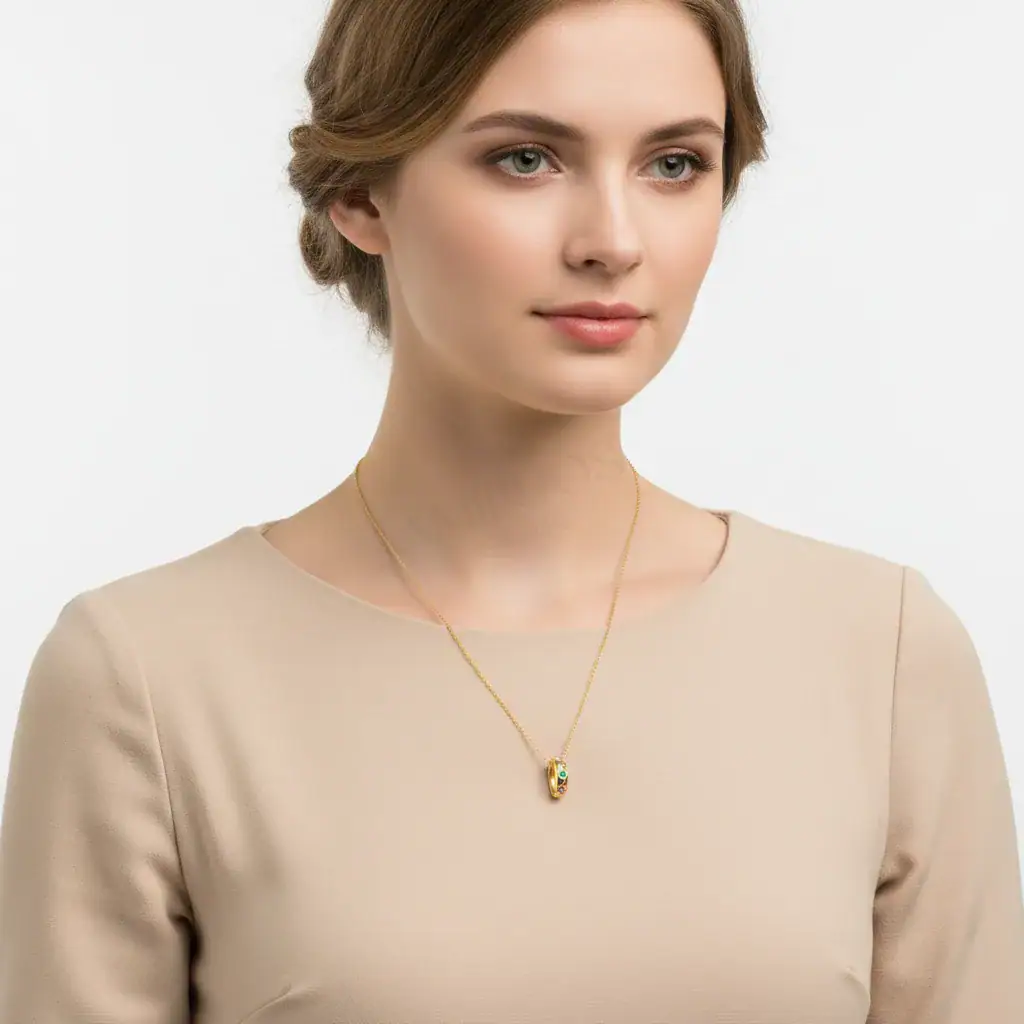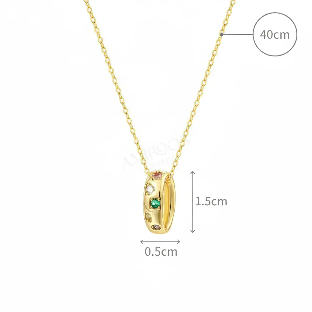 תליון משובץ צבעוני זה הוא תכשיט קסום שובה לב, עשוי בציפוי זהב צהוב מרהיב ומשובץ באבני זירקון צבעוניות המעניקות לו מראה עליז ומלא חיים. העיצוב העגול והמינימליסטי משלב בצורה מושלמת אלגנטיות ונוכחות, מה שהופך אותו לאביזר המושלם לכל אירוע.